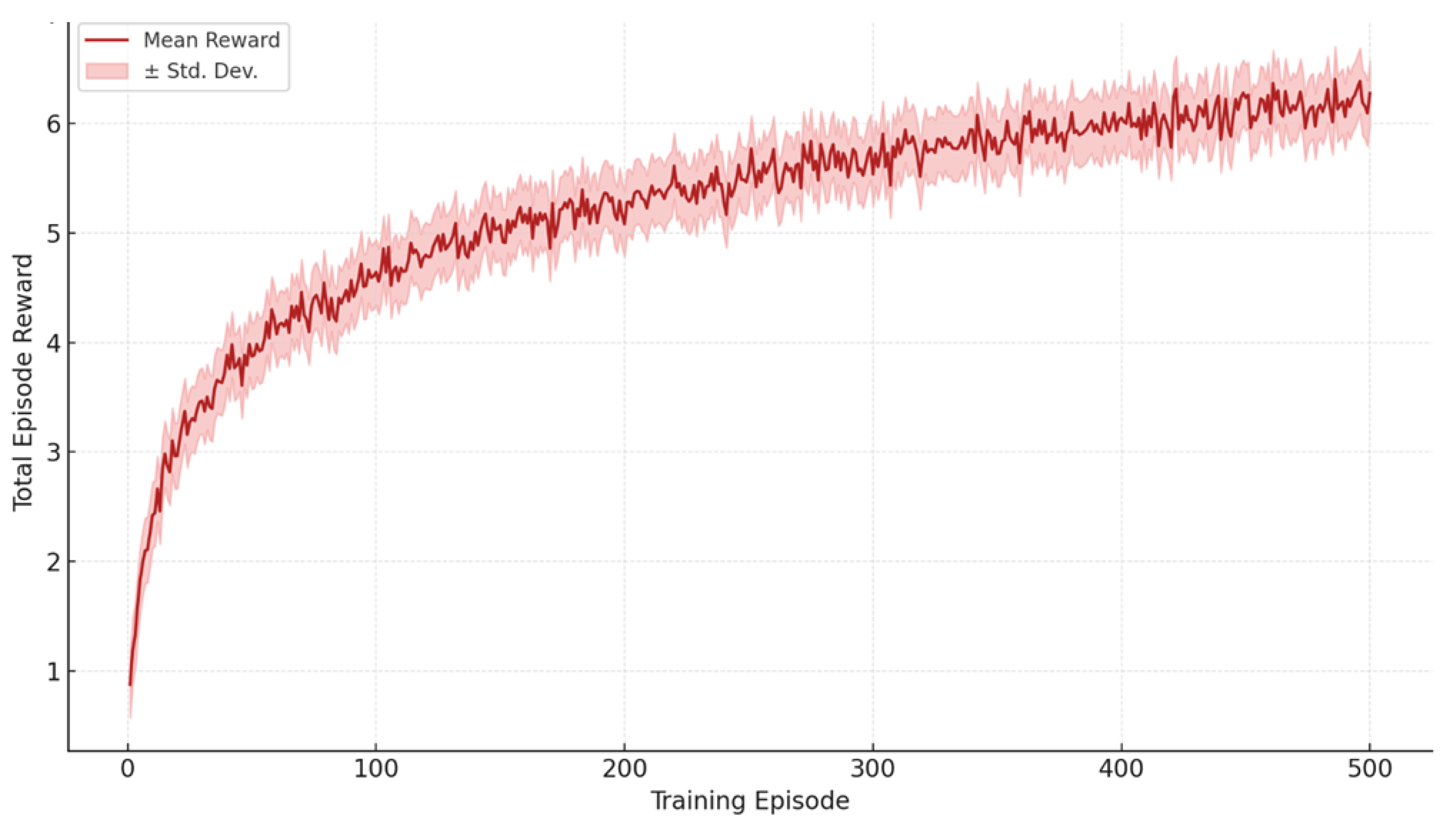 Figure 3 illustrates the learning progression of the reinforcement learning agent across 500 training episodes, where the vertical axis denotes the total episode reward and the horizontal axis indexes the episode number. The bold red curve represents the mean reward trajectory, which steadily increases following a logarithmic trend, indicating that the agent is gradually discovering more effective virtual impedance strategies. The shaded light red band enveloping the mean reflects one standard deviation around the average reward, capturing the variability in performance due to random initial states, stochastic impact loads, and policy exploration. Notably, the bandwidth narrows slightly over time, suggesting improved policy stability and reduced uncertainty as training converges. This visualization confirms that the SAC agent is successfully learning to balance multiple objectives—such as minimizing harmonic distortion and managing impact events—while improving its expected long-term reward under diverse operating conditions.