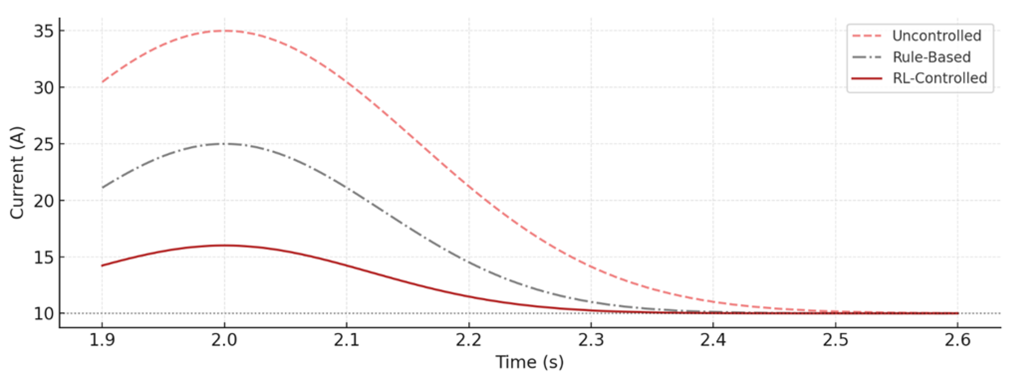 Figure 4 compares the current waveform observed at the converter output during a motor startup event under three control strategies: no impedance shaping, rule-based virtual impedance, and the proposed reinforcement learning (RL)-based adaptive impedance control. The uncontrolled case (dashed red line) shows a pronounced overshoot peaking at approximately 35 A—over 250% of the nominal current—followed by a long recovery tail, indicative of poor damping and limited transient suppression. The rule-based method (gray dashed-dot) reduces the overshoot to around 25 A, but still fails to eliminate residual oscillations and exhibits delayed stabilization. In contrast, the RL-controlled case (solid red) achieves a peak of just above 16 A and rapidly settles to nominal levels within 200 ms, demonstrating significantly improved transient shaping and impact resilience. The figure highlights how the learned impedance policy is not only effective in limiting peak current but also inherently stabilizes the system by modulating impedance in anticipation of and during the impact event, without requiring hard-coded event detection or manual tuning.