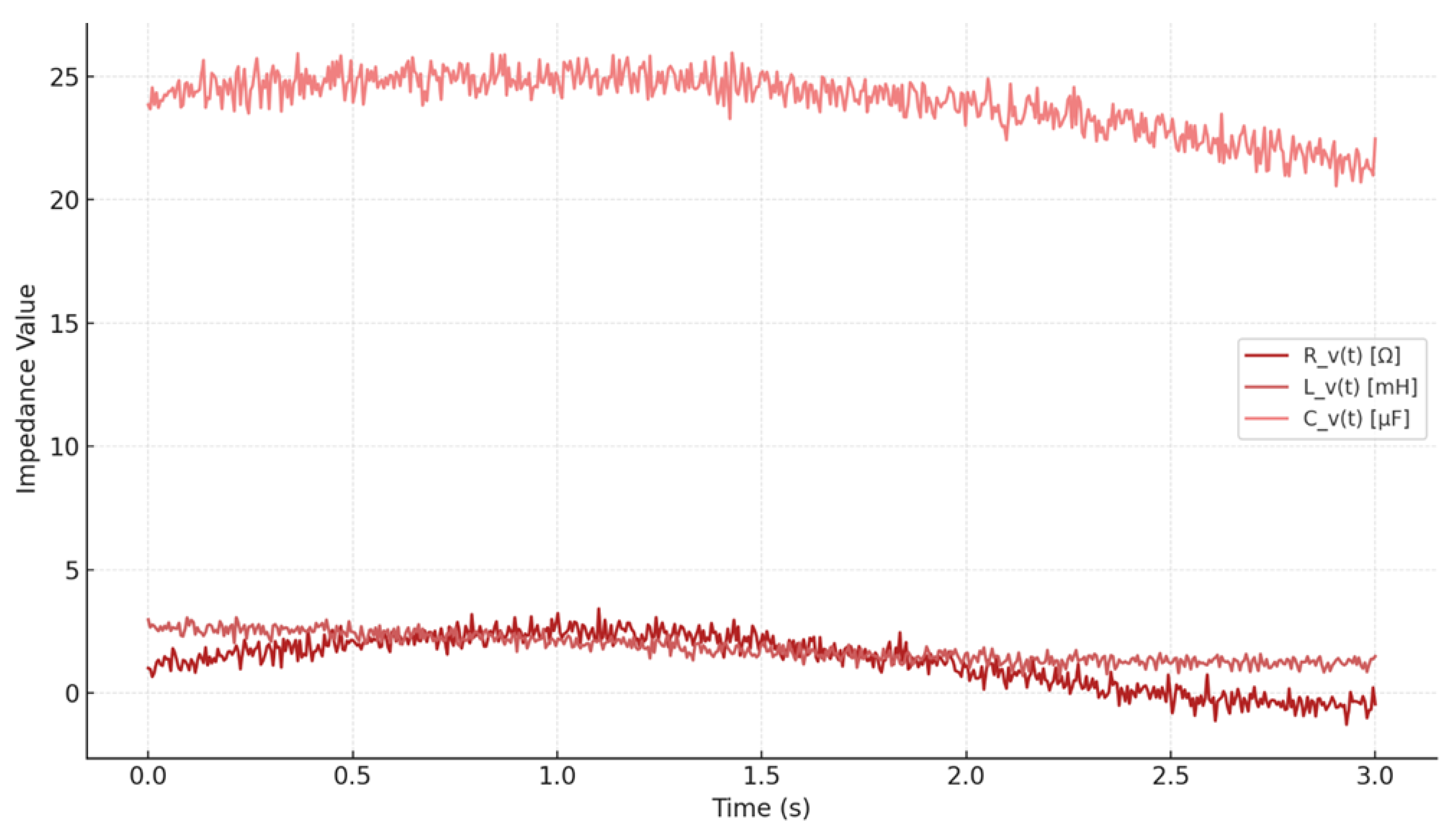 , plotted in a softer red, evolves more slowly and shows structured cycles, consistent with its role in tuning system reactance and suppressing mid-frequency harmonic components. Finally, the capacitive trace