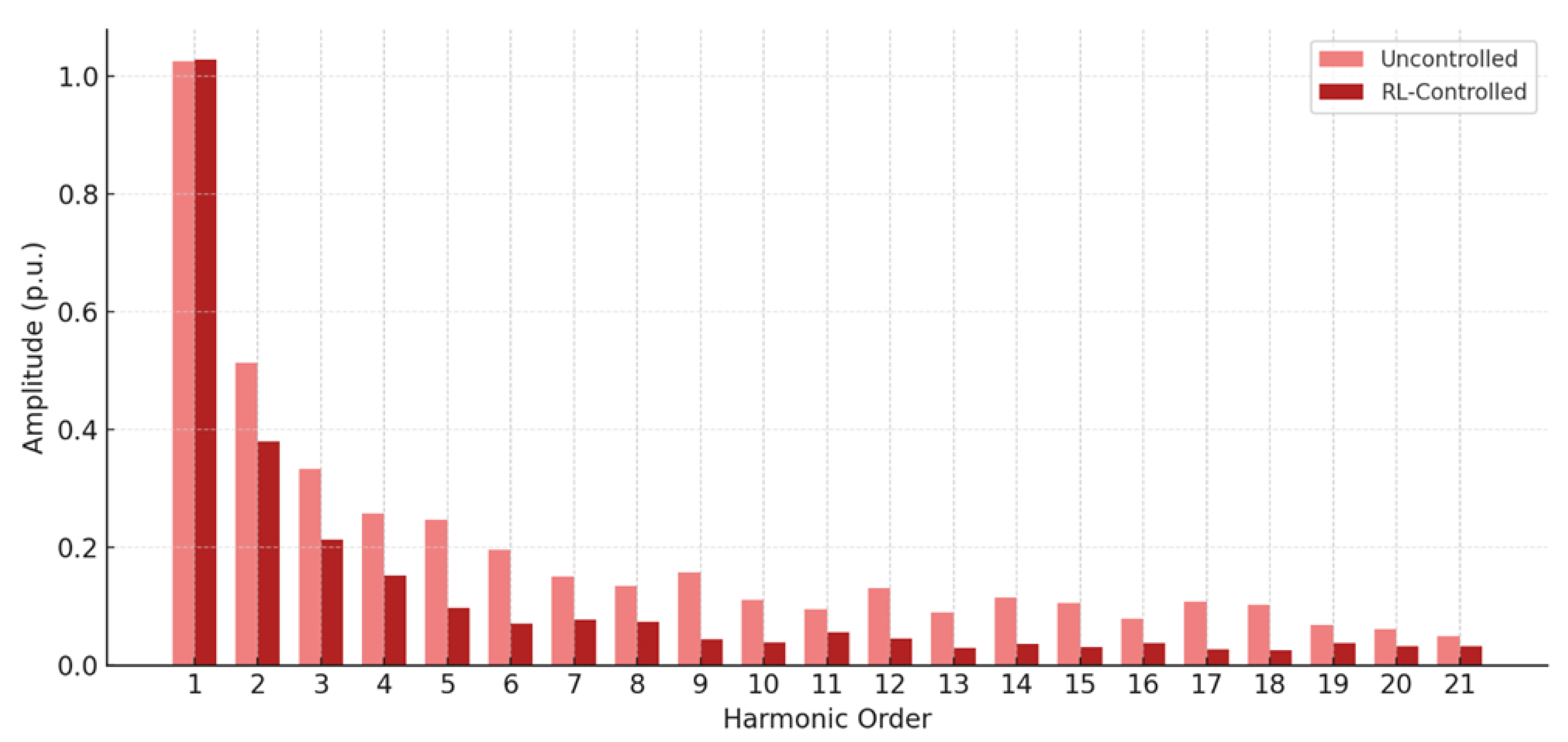 Figure 6 compares the frequency-domain harmonic spectra of the output voltage under two different control scenarios: an uncontrolled baseline and the proposed reinforcement learning-based virtual impedance control. The x-axis denotes the harmonic order from the 1st to the 21st, while the y-axis represents the corresponding amplitude in per-unit terms. The RL-controlled spectrum is consistently lower than the uncontrolled case across all non-fundamental harmonics. Specifically, the 3rd harmonic amplitude drops from approximately 0.28 p.u. (uncontrolled) to about 0.13 p.u. with RL control. Similarly, the 5th harmonic is reduced from 0.19 p.u. to 0.09 p.u., and the 7th harmonic from 0.12 p.u. to 0.05 p.u. These differences are visually evident through paired bars for each harmonic order. The most significant reduction occurs in the low- to mid-order harmonics (3rd to 11th), which dominate the distortion profile in typical nonlinear load environments. For example, the 9th harmonic drops from 0.09 p.u. to below 0.03 p.u., marking a 66 percent reduction. The tail-end harmonics beyond the 15th order remain relatively small for both cases but still exhibit noticeable attenuation under the RL policy. This behavior aligns with the physical model’s focus on low-frequency impedance shaping through dynamic R and L modulation, while the C component suppresses resonant interactions in the mid-frequency band. The reduced spectral energy density translates directly into lower total harmonic distortion and improved power quality.