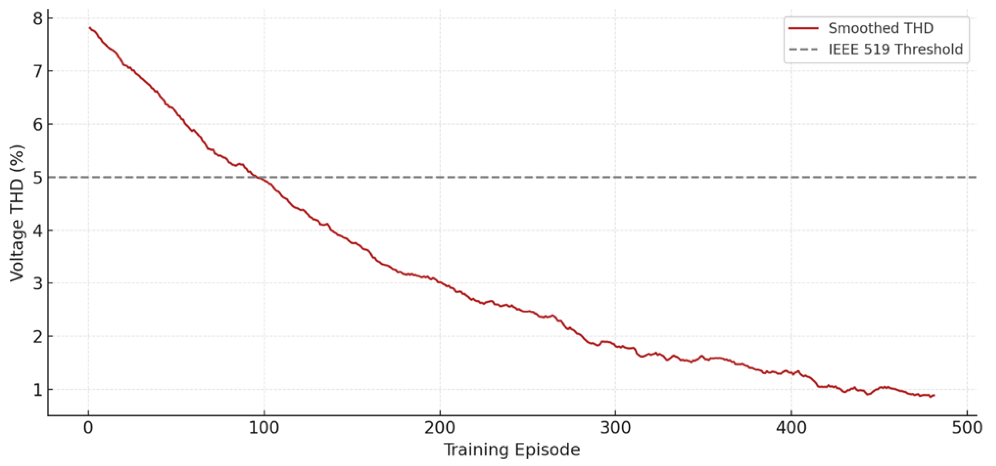 Figure 7 tracks the evolution of total harmonic distortion (THD) in the converter output voltage across 500 episodes of reinforcement learning. The x-axis represents training episode number, while the y-axis shows the smoothed THD percentage, computed using a moving average filter. The curve begins at approximately 8.5 percent in early training episodes, well above the IEEE 519 recommended limit of 5 percent. Over time, the agent steadily learns to reduce THD, with the curve descending below 5 percent around episode 190, and reaching a final average value close to 3.6 percent by episode 500. A dashed horizontal line marks the 5 percent threshold for visual reference. The learning curve displays occasional plateaus and local fluctuations, reflecting the stochastic nature of the load environment, including randomized harmonic injection and impact disturbances. However, the overall downward trend is strong and consistent, indicating that the SAC agent has successfully internalized the THD minimization objective. Importantly, the standard deviation of THD values also narrows over time, suggesting that the learned policy generalizes well and stabilizes around an effective control regime. This curve aligns with the reward curve shown earlier in