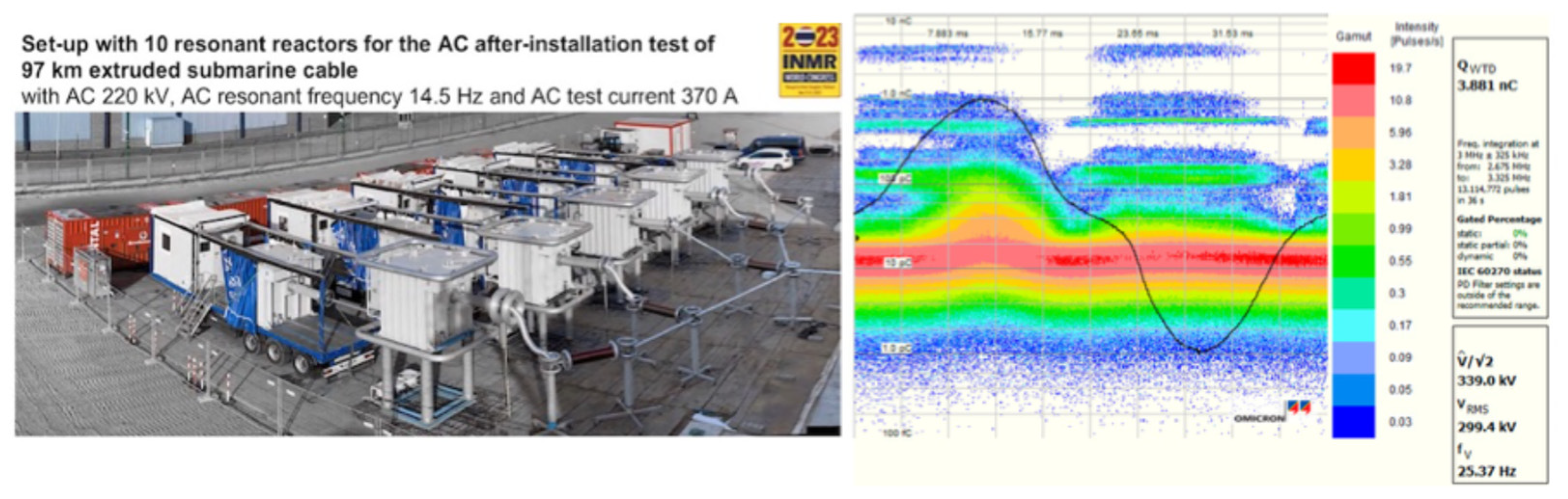 Inter-array cables, generally rated up to 66 kV, connect clusters of wind turbines (typically 5 to 10) in string configurations to the offshore substation. While individual IAC segments may be only 1–4 km long, even longer lengths can be applied, allowing the full length of a complete string to extend up to 15–20 km. Testing these strings in their entirety is logistically complex due to limited access and space constraints on the WTG or offshore substation platforms. As with export cables, conventional AC testing systems are often unsuitable due to their large footprint, weight, and power requirements. Moreover, it is technologically impossible to conduct dedicated tests (monitored by accurate partial discharge measurement) during on-site acceptance tests.