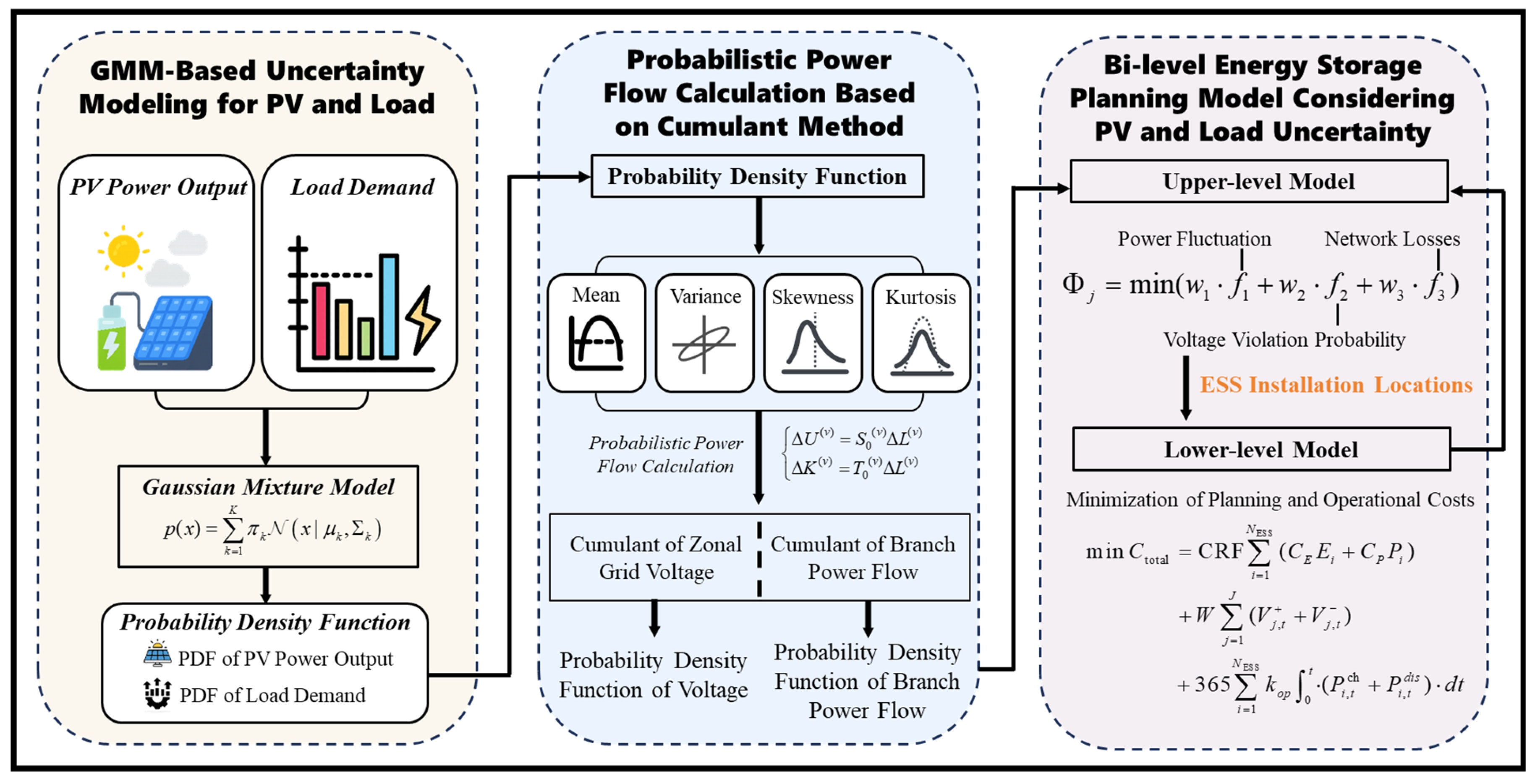 - We established a two-layer energy-storage planning framework that explicitly incorporates PV and load uncertainties. The model optimizes both the location and capacity of energy storage systems to mitigate voltage violation risks induced by intermittent renewable generation and variable demand.