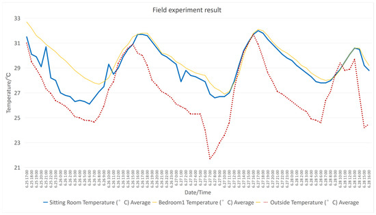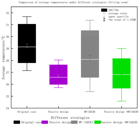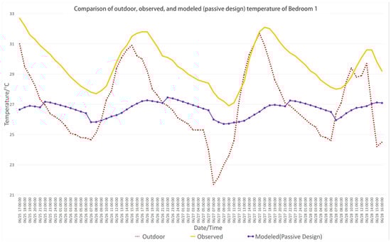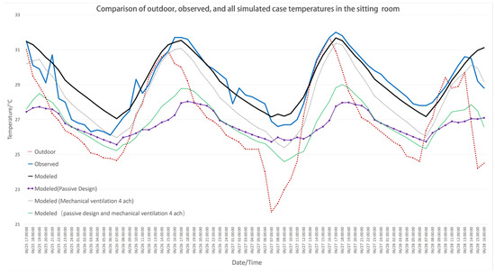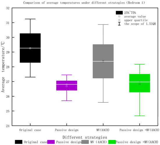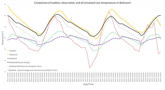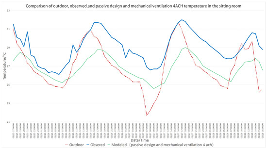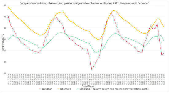 - Passive design is highly effective in improving indoor thermal comfort compared to mechanical ventilation. The simulation data in the box plots show that the mean temperature is reduced by 3 °C to 4 °C compared to observed temperature (field experiment result) or mechanical ventilation, with the cooling effect being most significant over the entire time period.