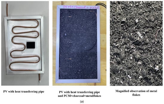 This study employs three 10 W polycrystalline PV modules. The first unmodified module serves as a reference PV module (PVnoPCM). The second PV module was integrated with charcoal and LA, while the third incorporated charcoal, metal flakes, and LA. Both PV modules are equipped with a 450 g thermal energy storage unit, through which a serpentine heat transfer pipe passes through the shape-stabilised PCM, as shown in Figure 1a. The technical parameters of the PV modules and thermal energy storage units are detailed in Table 3. The grated shape-stabilised PCMs were applied to the PV module’s Tedlar surface with a thickness of 1.5 cm, and the backside of the PCM was enclosed with a 5 mm acrylic glass layer. While increasing the thickness of the PCM would enhance the cooling effect, it poses challenges such as added weight, handling difficulties, and increased cost, making it unsuitable for commercial applications. Additionally, active cooling systems with a water flow inside the PCM unit do not necessitate more heat storage capabilities than passive cooling techniques. However, a 1.5 cm thickness of PCM without fluid motion could have adverse effects on cooling the PV module, especially when composited with charcoal. This study primarily focused on the active cooling system. Furthermore, this study aimed to perform the PV module cooling process using a minimal amount of PCM. For this purpose, a 1.5 cm PCM layer was integrated onto the Tedlar surface, which fits within the PV module frame without requiring additional modification to the PV/PCM unit and allows smooth enclosure using acrylic glass.