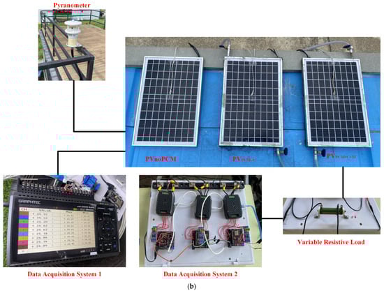 All three PV modules were mounted at a fixed tilt angle of 16◦, and the experiments were conducted at Kamphaeng Phet Rajabhat University (KPRU), Thailand. The experiments were carried out during October and December, transitional periods between the monsoon and winter seasons, when hot water demand typically increases. K-type thermocouples were employed to measure the PV module temperature, PCM backside surface temperature (acrylic), ambient temperature, water inlet temperature, and water outlet temperature, as shown in Figure 1b. The solar irradiance was collected from the zero-energy building at the energy park (KPRU). Temperatures and solar irradiance were recorded at one-minute intervals using a data logging system, while the electrical output of the PV modules was measured every 60 min. The PV module’s maximum voltage and current were manually measured using a variable resistance.
