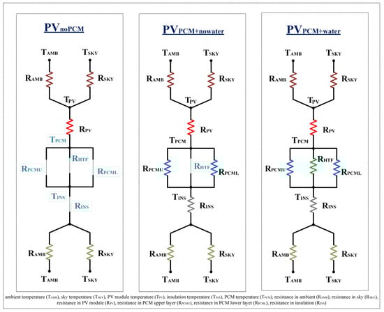 Figure 2 shows the heat transfer mechanism of the developed system compared with an uncooled PV module. The left-hand side (PVnoPCM) represents the heat transfer network of a PV module operating without an external cooling agent. Typically, the front surface of the PV module (solar glass) naturally dissipates heat energy to the surroundings and the sky, which is generated during the power conversion process. Depending on the airflow over the flat surface of the PV module, heat dissipation to the ambient environment occurs via natural convection (RAMB). Additionally, with or without the temperature difference between the PV module’s front surface and the surroundings, heat is dissipated to the sky through radiative heat transfer (RSKY). Although heat energy is naturally ventilated, the PV module operates under significant thermal stress due to elevated ambient temperatures and a lack of consistent wind speed. The back surface of the PV module also dissipates heat using the same methods as the front surface; however, the back surface encounters higher resistance to heat dissipation.