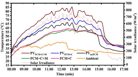 Meteorological and thermal profiles of PVnoPCM, PVPCM+C, and PVPCM+C+M.