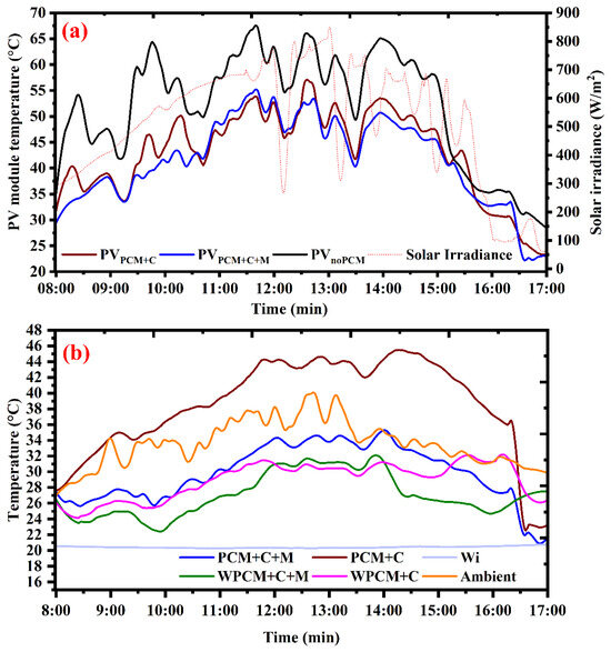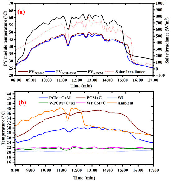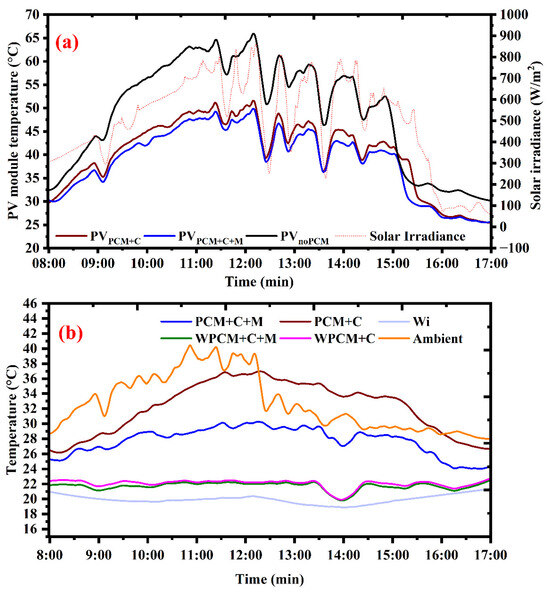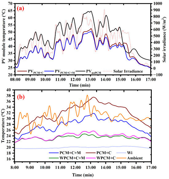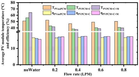 Comparatively, the reduction in PV module operating temperature enhances the efficiency of the PV module across all cases. The temperature-corrected average PV module efficiency and corresponding temperature profiles are shown in Figure 8. Aside from the case without water flow, the PCM + C + M-assisted PV modules achieved greater efficiency enhancement than both the PCM + C and PVnoPCM. Overall, it is concluded that increasing the water flow rate helps to maintain the PCM in a mushy state for a prolonged period; however, it results in a decrease in outlet water temperature.