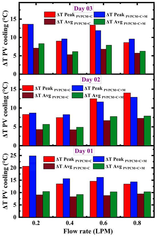 A summary of the different flow rates and their impact on cooling the PV module is shown in Figure 9. Comparatively, a flow rate of 0.2 LPM achieved the most significant reduction in the PV module’s operating temperature, with peak differences of 20.63 °C and 24.82 °C for the PCM + C and PCM + C + M, respectively. However, other water flow rates did not exhibit a similar peak cooling effect. Notably, the average cooling effect was consistent across the different flow rates (0.2, 0.4, 0.6, and 0.8 LPM), with temperature differences of 9.06 °C, 8.31 °C, 8.78 °C, and 9.47 °C for PVPCM+C and 10.41 °C, 9.20 °C, 10.30 °C, and 10.31 °C for PVPCM+C+M, respectively, on Day 1. To evaluate the consistency of the developed system, the peak and average cooling rates for selected Day 2 and Day 3 are shown in Figure 9 and Figures S1–S8. While the cooling effect varied across the experimental days, the flow rate of 0.2 LPM consistently achieved the highest cooling effect. Additionally, to assess the effectiveness of increased water flow rates, the PV module operating temperatures were normalised, as the experiments were conducted under varying operating conditions.