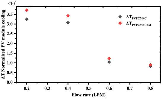 The reduction in PV module temperature is normalised to solar irradiance, ambient temperature, and water flow rate, as expressed in Equation (1). The experiments were conducted under outdoor conditions, where solar irradiance and ambient temperature acted as independent variables, while PV module operating temperatures were dependent on these factors. In this context, the water flow rate was considered for normalisation alongside the other two independent variables. Figure 10 shows a comparative analysis of PV module cooling under different flow rates. The lowest flow rate of 0.2 LPM demonstrated a higher cooling effect compared to other flow rates.