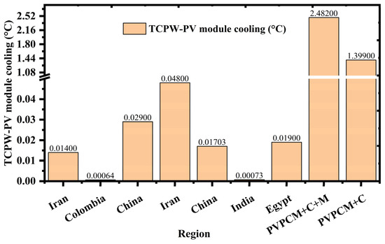 Table 4 presents a geographical comparison of PCM-assisted PV module cooling with the results of the presented study, including PCM + C and PCM + C + M. In Iran, a cooling effect of 20.42 °C was achieved using a PCM mass of 2 kg, while in China, a cooling effect of 19.2 °C was attained with 12.6 kg of PCM. In comparison, the developed PCM + C + M system achieved a cooling effect of 24.82 °C with only 190 g of PCM, which is the lowest PCM quantity reported in the literature. Similarly, PCM + C achieved a cooling effect of 20.63 °C using 280 g of PCM. Although the developed system achieved a higher cooling effect, a direct comparison with the existing studies is challenging due to differences in PCM quantities and PV module capacities. To facilitate a standardised comparison, the cooling effects reported in existing studies were normalised to the 190 g of PCM used in the PVPCM+C+M system with the PV module capacities. This comparison is expressed as thermal cooling per 190 g of PCM and 1 Watt (TCPW). Figure 11 shows the normalised cooling effects of PV modules using different PCMs. Studies conducted in Columbia and India reported lower cooling effects, while other locations achieved moderate cooling effects. Notably, the PVPCM+C+M system attained the higher TCPW cooling effect of 2.482 °C, whereas PVPCM+C achieved 1.399 °C. This indicates that the PVPCM+C+M system enhanced the cooling effect with a significantly reduced PCM quantity compared to PVPCM+C and other existing models.