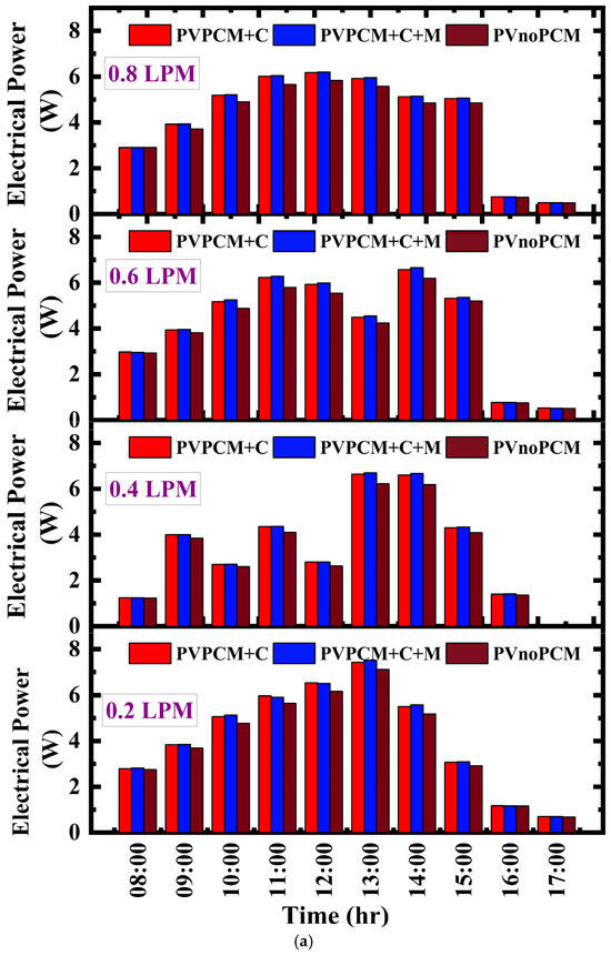 Figure 12a depicts the electrical power generation of PV modules with and without PCM. The highest power generation was recorded at 13:00 for PVPCM+C+M, reaching 7.51 W. The corresponding power outputs for PVPCM+C and PVnoPCM were 7.42 W and 7.11 W, respectively. PVPCM+C+M achieved the highest average power generation of 4.23 W, which was 0.02 W and 0.23 W higher than PVPCM+C and PVnoPCM, respectively. Similarly, the highest thermal power was attained by PVPCM+C+M, peaking at 151.53 W, where a water temperature difference of 10.88 °C was observed. However, PVPCM+C achieved a higher average thermal power generation of 115.65 W, which was 20.76 W greater than that of PVPCM+C+M, as shown in Figure 12b and Table 5. An increase in the water flow rate resulted in reduced thermal power, as the temperature difference between the inlet and outlet water decreased due to the lower pressure and reduced surface interaction with the PV/PCM temperatures. For a flow rate of 0.4 LPM, the average thermal powers were 50.82 W and 45.45 W for PVPCM+C and PVPCM+C+M, respectively. When the flow rate was increased to 0.6 LPM and 0.8 LPM, the average thermal powers dropped to 25.66 W and 20.94 W for PCM + C and to 21.11 W and 15.16 W for PCM + C + M, respectively. The average electrical and thermal power generations for PVnoPCM, PVPCM + C, and PVPCM + C + M are summarised in Table 5. As previously noted, increasing the water flow rate failed to enhance the cooling effect, and flow rates exceeding 0.4 LPM led to a decline in thermal power generation compared to electrical power generation. The overall combined PVPCM+C electrical and thermal power generation for the PVPCM+C at flow rates of 0.2 LPM, 0.4 LPM, 0.6 LPM, and 0.8 LPM were 119.86 W, 54.23 W, 29.85 W, and 25.09 W, respectively. Similarly, PVPCM+C+M achieved a combined power generation of 99.12 W, 48.87 W, 25.54 W, and 19.33 W, respectively. It was observed that PCM + C + M enhanced electrical power generation, while PCM + C produced a higher thermal power. In terms of combined power generation, PCM + C demonstrated superior performance compared to PCM + C + M. However, PCM + C + M utilised only 190 g of LA, representing a 47.36% reduction in PCM consumption compared to PCM + C. Considering electrical power generation, PCM + C + M is recommended due to its higher electrical power output combined with lower PCM consumption. Comparatively, the thermal power extracted by PCM + C + M would be higher if the thermal power was evaluated based on the PCM quantity used for developing a hybrid application.