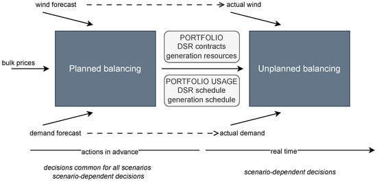 In the planned balancing stage, decisions are made regarding the operation of the power system over a specific time horizon. In real time, the actual system state may deviate from the planned state, necessitating additional balancing actions. Importantly, the decisions made during the planned balancing stage influence the availability of resources that can be utilized for unplanned balancing. The entire process is illustrated in Figure 2.
