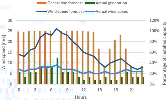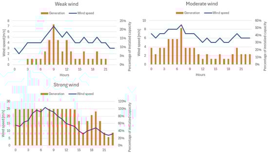 While flexible generators can be controlled, wind power plants are considered to be inflexible power sources. Let denote the total installed wind power capacity in the cluster. We assume that a wind forecast is available, allowing the operator to estimate the share of installed capacity that will be utilized. The forecasted energy generated by wind power plants at hour h is given by , where is the forecasted share (a fraction) of installed wind power capacity.
