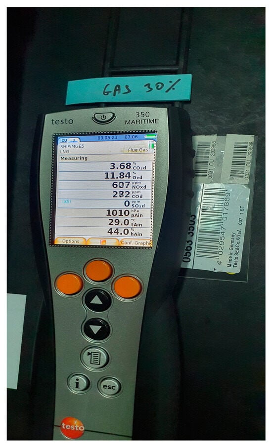 Care was taken to ensure that the accuracy of the measuring equipment was such that the maximum tolerances of the values specified in 1.3.1 of Annex 4 of the Technical Code 2008 were not exceeded. Care has also been taken to ensure that the gaseous emissions sampling probes are located at least 0.5 m or three times the diameter of the exhaust pipe, whichever is greater, upstream of the exhaust system outlet, as far as practicable, but close enough to the engine to ensure an exhaust gas temperature of at least 343 K (70 °C) at the probe in accordance with the test cycles defined in 3.2. of Technical Code 2008 [23] as can be seen in Figure 6, which was taken during the actual recording for the purposes of this article.