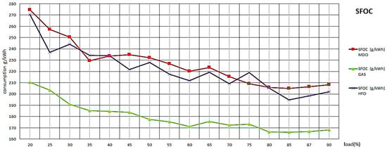 Figure 2 graphically presents the recorded data for SFOC for all three fuel types and as a function of the engine load.