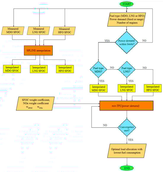 The model considers three fuel types, as in previous research: Heavy Fuel Oil (HFO), Marine Diesel Oil (MDO), and Liquefied Natural Gas (LNG), with all operational data stored in a predefined input file. The optimization process uses a combination of spline interpolation performed in MATLAB, as explained in [35] and defined in previous research [1], to uniformly fit the data and cost functions based on specific fuel oil consumption and NOx emissions. The workflow of the optimization model is illustrated in Figure 8 and shows the main steps, including the processing of the input data, the optimization process, and the comparison of the results.
