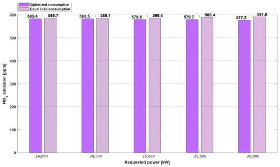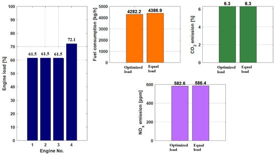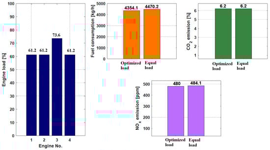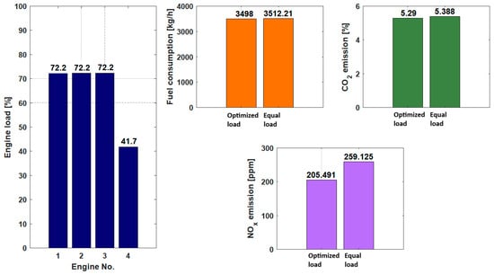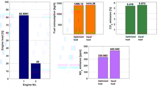 In summary, the optimized load scenario allows for more efficient and environmentally friendly operation with this type of fuel compared to an equal load distribution and confirms the model’s ability to balance fuel efficiency and emission control, especially for NOx.