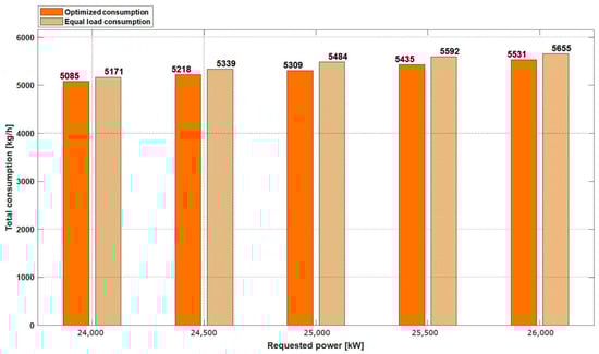 At an output of 24,000 kW, for example, the consumption at the equal load is 5171 kg/h, while the optimized consumption is lower at around 5085 kg/h, i.e., 1.66% less fuel is consumed.