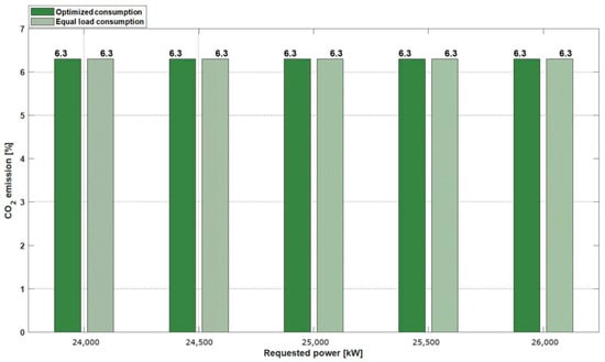 Figure 14 shows the comparison of CO2 emissions at different requested power levels (24,000 kW to 26,000 kW) for both optimized and uniform load distribution scenarios. As can be seen from the graph, the percentage of CO2 emissions remains constant at 6.3% in both cases, regardless of the requested power or load distribution. This is consistent with the assigned weighting factor of 0 for CO2 in the optimization model, indicating that CO2 emissions were not directly considered in the optimization process. Consequently, the model’s focus on other factors, such as fuel consumption or NOx emissions, has no significant impact on the level of CO2 emissions, which remain stable across all power levels.