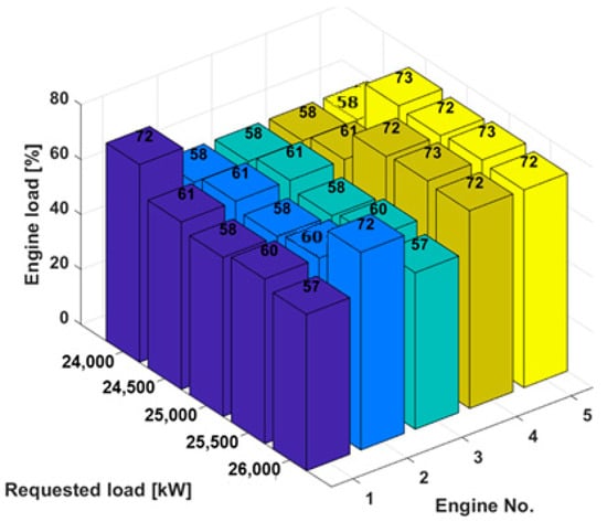 Percentage load distribution across the engines for the power range of 24,000–26,000 kW.