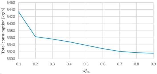 Figure 17 shows the relationship between the weight factor (wfFC) and the total fuel consumption in kilograms per hour (kg/h). The values range from wfFC = 0.1 to wfFC = 0.9.