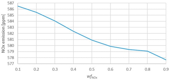 A uniform decrease in NOx emissions can be observed when wfNOx increases. This shows that the optimization model effectively reduces NOx emissions when the weighting factor that prioritizes NOx emissions is increased.