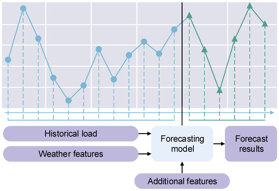 where is the forecasting window length; is the look-back window length; is the predicted load; and , and denote the historical load, meteorological information and additional features, respectively. The function represents the nonlinear mapping learned through the neural network to forecast future loads based on past observations.