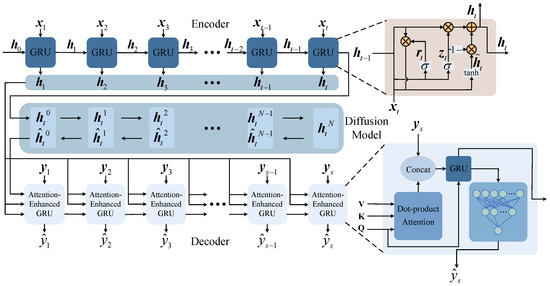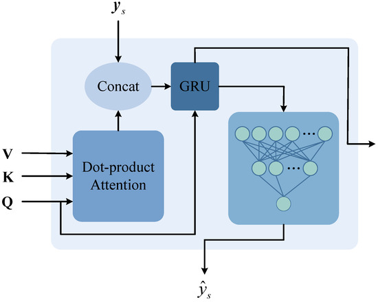 where , and denote the query, key and value matrices, respectively, and is the dimension of the key vector. The attention weights were computed by scaling the dot-product between queries and keys, followed by a Softmax operation to obtain normalized weights. These weights were then used to aggregate the values, yielding the context vector. At the current time step, let be the input label, be the predicted value and be the previous hidden state, respectively. The GRU update with the attention can be expressed as