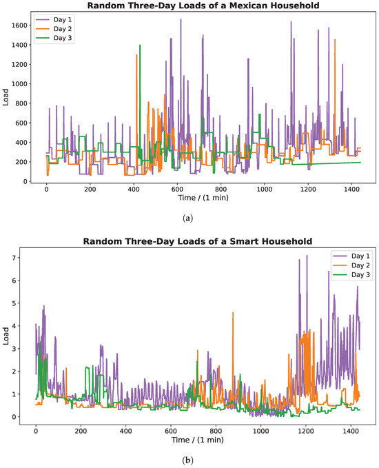 Random three-day load profiles for two households illustrating the variability in energy consumption patterns. (a) Load profile of a Mexican household. (b) Load profile of a smart household.