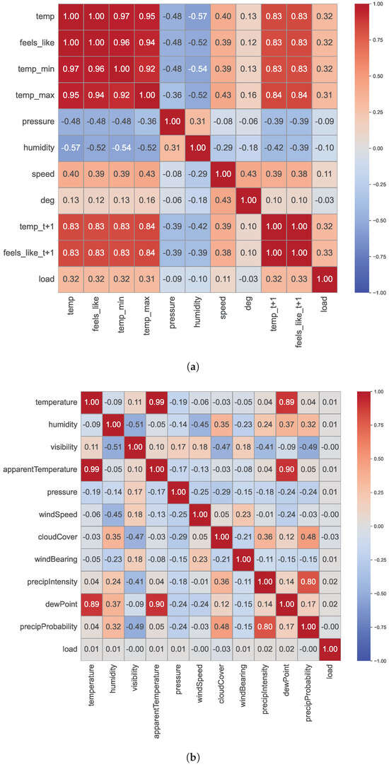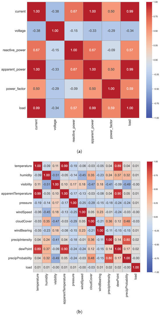 Correlation heatmaps for the load data from two households. The color indicates the strength of relationships, with brighter ones representing the stronger correlation, highlighting the difference arising from the appliance configuration and usage pattern. (a) Load correlation heatmap of load data for the Mexican household. (b) Load correlation heatmap of load data for the smart household.