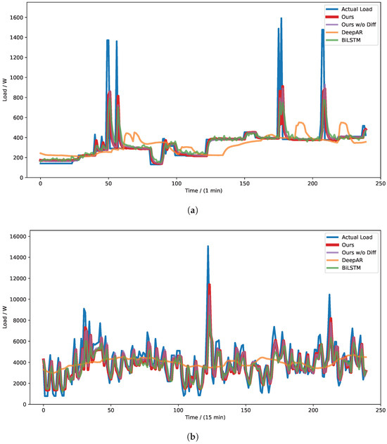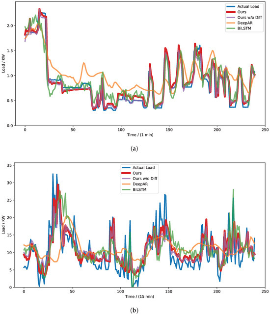 It is inferred that the prediction accuracy at the 1 min interval level exceeded that at the 1 min interval level. The finer granularity of the 1 min interval data preserves more detailed temporal features, allowing the model to capture the short-term dependency and dynamic patterns within the shorter prediction horizon. In contrast, the 15 min interval data, with larger intervals, might smooth fluctuations and reduce feature granularity, instead of increasing the prediction difficulty. Furthermore, the aggregation of the 15 min interval data from the 1 min interval data would incur the loss of critical weather-related and load-specific features (which are essential for accurate forecasting). As such, the aggregated data often fail to capture transient load fluctuations and rapid weather changes and to identify the fine-grained temporal dynamics.