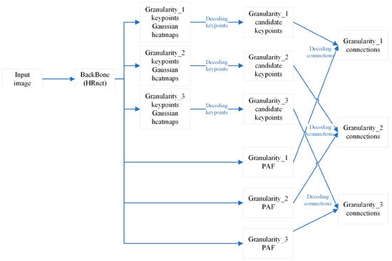 where is the loss coefficient for the i-th granularities, with weights of 0.2, 0.4, and 1 assigned to the three levels, respectively, and denotes the loss associated with the i-th fine granularity. All losses are evaluated using MSE, while both the heatmap and PAF contribute to output generation and participate in the calculation of losses.