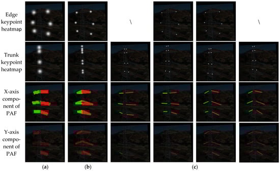 In addition, it is worth noting that the power tower poses a challenge where keypoints of the same type are interconnected. However, this issue does not exist in human pose estimation. Therefore, a fixed order is established for connecting different types, while the relative position between keypoints of the same type is determined during target generation based on their left and right order to prevent network confusion. Figure 3 illustrates the ground truth representation of heatmaps for keypoints and PAF maps depicting connections among three intricate electrical tower crossbars.