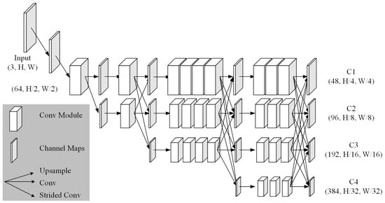 The High-Resolution Network (HRNet) serves as the backbone of the model, featuring a multi-resolution parallel network with each scale branch performing convolution operations to achieve superior performance in multi-scale and high-resolution tasks, and its network structure diagram is shown in Figure 4. The model consists of four stages, each containing 1, 1, 4, and 3 convolution modules, respectively. These modules adopt a residual structure similar to ResNet [31] to prevent gradient vanishing. Finally, the output feature layers for four sizes are set at 48, 96, 192, and 384 channels.