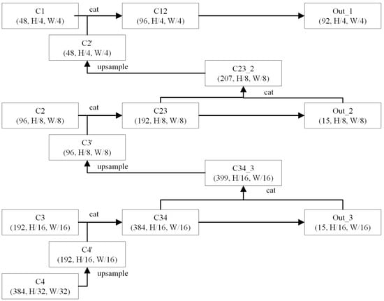 The neck of the model is specially designed in this paper, and its structure is illustrated in Figure 5. Due to the evident progressive relationship between the three-granularity output, a Feature Pyramid-like structure is adopted. Simultaneously, the outputs from the previous two levels are merged with the input and upsampled to contribute to the next level’s output, while intermediate supervision is achieved by calculating the loss between the input and target.
