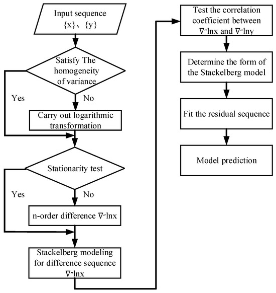 - A Stackelberg model is established for the input sequence after nth order difference {∇n ln yt}, as shown in Equation (5).