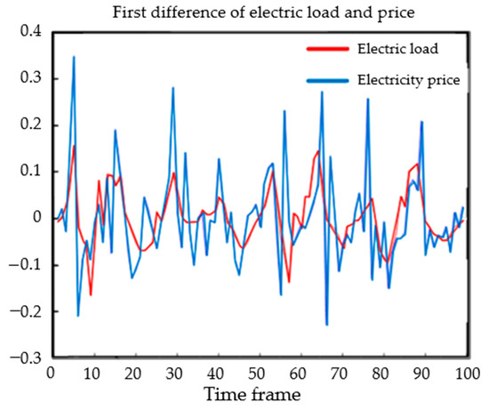 - The stationarity of the logarithmic transformation sequence {ln yt} of electricity price series and logarithmic transformation sequence {ln xt} of load series is tested. If the stationarity of the sequence meets the established criteria, the next steps are continued. If the stationarity of the sequence does not meet the requirements, the logarithmic difference processing should be performed on the sequence and the stationarity test should be re-performed. If the test results show that the sequence still does not meet the stationarity criterion, second-order differential processing should be further performed until the stationarity of the sequence meets the established requirements.