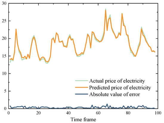 According to the data in Figure 13, after excluding the two sets of data that could not be simulated, the remaining valid data total is 98 sets. Among them, there are only two groups with an absolute error value of more than 1, and only two groups with an absolute error percentage of more than 5%. At the same time, there were 32 sets of data with an absolute error percentage of less than 1%. This indicates that the Stackelberg electricity price prediction model constructed in this study has high prediction accuracy and high fitting degree.