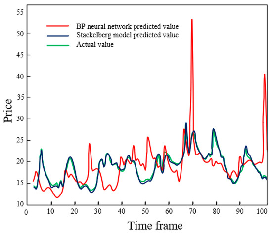 According to the analysis results in Table 6, compared with the Stackelberg model, the neural network BP method shows large errors and biases in electricity price prediction, the difference between the predicted value and the actual value is more significant, and the image of the prediction result is more disorganized. Although the calculation process of the neural network BP method is relatively simple, the fitting error of the model is large, so, compared with the neural network BP method, the Stackelberg model is more suitable for predicting this group of multivariable electricity price data.