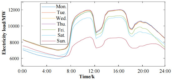 Figure 2 shows the load curve of a certain week (14 July~20 July) in this area, and the daily electricity load within a week has a certain regularity. At the working day stage, people are in a state of production and life, and the load of office buildings and enterprises is heavier, with a peak load up to 12,000 MW, while the situation is just the opposite on weekends. The minimum load is 7000 MW. Therefore, the load on working days will be slightly higher than that on rest days, and the load has obvious weekly periodicity. To meet the accuracy requirements of load forecasting, the influence of weekly differences should be considered.