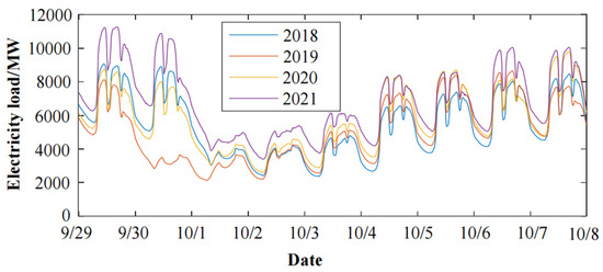 Considering the influence of important holidays, the load data of the region during and around the National Day in the past four years were taken as an example to analyze the holiday characteristics of the regional load, as shown in Figure 4. The variation trend of power load during National Day in four years is the same; the peak load reaches 8000 MW, and the minimum load is 2200 MW. The load in early October is significantly lower than before the holidays. This is mainly because most industrial and commercial activities are stopped during the holidays, so the impact of holidays on the load is more obvious. When establishing the forecast model, whether the forecast date is a holiday should also be taken into account in the model.