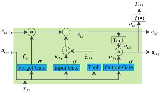 LSTM is an extended neural network proposed on the basis of the defects of standard RNN neural network, as shown in Figure 7. It adds a “processor” that can judge the function of signals. Each processor consists of three gates, namely, the forgetting gate, the input gate, and the output gate [30,31]. The input signals are processed by the sigmoid function.