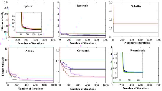 To show the overall performance of IPSO more intuitively, the IPSO algorithm is compared with other improved PSO algorithms such as CW-PSO, CLDIW-PSO, and (tan, sin)CNIW-PSO algorithm. The parameters are set as follows: The number of particles in PSO is 40, the dimension of each particle is 30, and the number of iterations is 1000. The green line represents the performance of CW-PSO, the red line represents the performance of CLDIW-PSO, the purple and blue lines represent the performance of two (tan, sin)CNIW-PSO, and the black line represents the performance of IPSO. The test function is shown in Equation (21). The optimal value of the function is presented in Table 3, while the calculation results are illustrated in Figure 9.