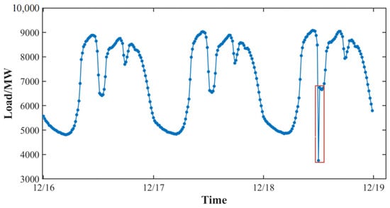 The 24-h weather data of 18 December were selected for load forecasting, but the abnormal data at noon on 18 December were identified based on the historical load data. The abnormal load is shown in the red part of Figure 10, and the abnormal data should be corrected using a similar day method.