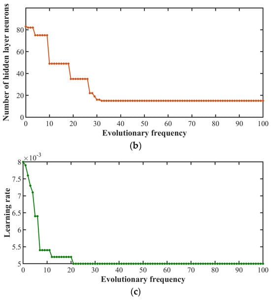 LSTM hyperparameter training results by IPSO algorithm: (a) Adaptation changes; (b) Variation in the number of neurons in the hidden layer; (c) Learning rate change.