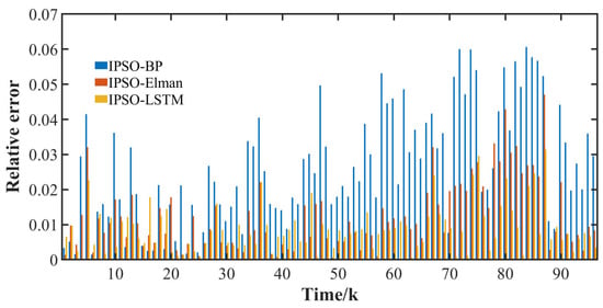The aforementioned results were input into the prediction model, and the Adam method was employed for the iterative training of the LSTM neural network. The initial 90% of the sequence was utilized for training in order to acquire the optimal weight and threshold, while the remaining 10% of the data served as a test set for testing purposes. The architecture of the neural network model with LSTM is 107 × 15 × 96, and the learning rate is set at 0.005. In contrast, the BP neural network structure is 107 × 22 × 96, with a learning rate of 0.0009. Furthermore, the constructed Elman neural network has a structure of 107 × 13 × 13 × 96, a learning rate of 0.004, and a total number of iterations amounting to 500. The actual load curve of a specific day in the test set along with the prediction curves of the three different models are depicted in Figure 14. The relative errors of various methods at different times are illustrated in Figure 15. Lastly, the calculation results are presented in Table 6.