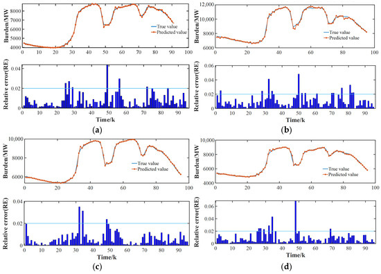 As can be seen from the results of Figure 16 and Table 8, in the prediction of typical days in different seasons, this method can keep the relative error of more than 90% of the sampling points below 2%, and the relative error of the square pair is basically below 1%, and the value of the root-mean-square error and the average absolute error account for a small proportion of the daily base load level. The above results indicate that this model has relatively good applicability.