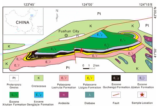 Geological map of the Fushun Basin with the location of our sampling site (modified from Meng et al. [25]).